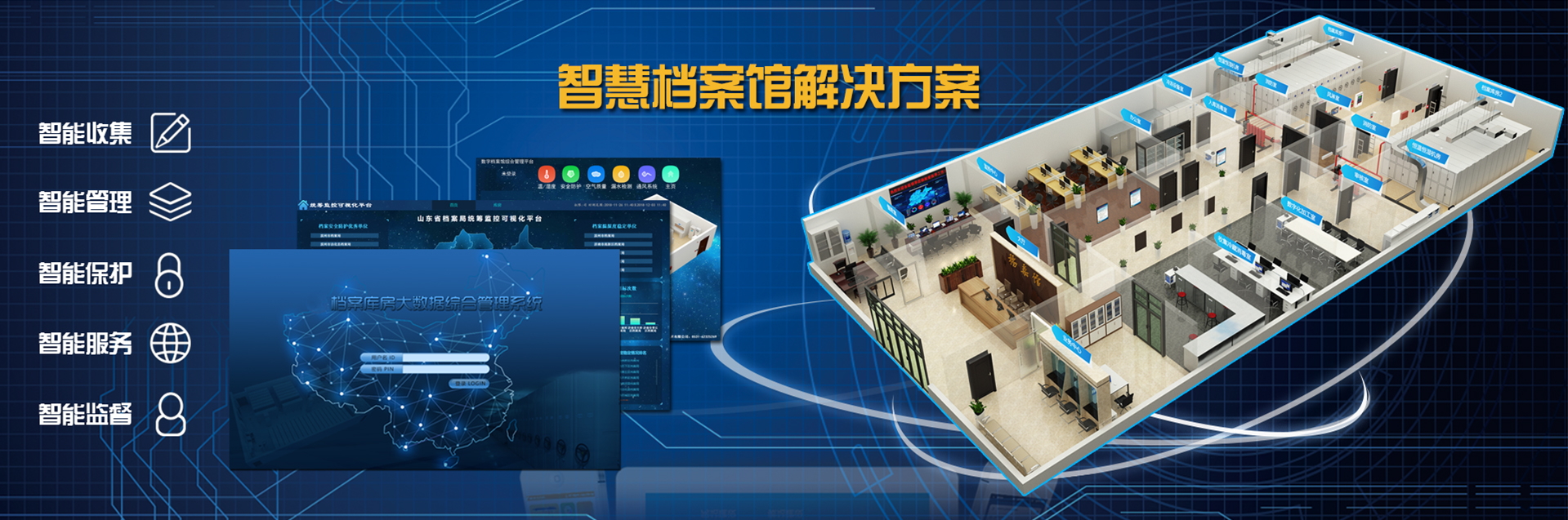 國(guó)韻為山東省公安廳檔案庫(kù)房設(shè)計(jì)建設(shè)的檔案庫(kù)房智能化綜合管理系統(tǒng),從溫濕度、光線(xiàn)、氣體、灰塵、火、水及有害生物入手,有效地解決了檔案安全保護(hù)的問(wèn)題,改善了檔案庫(kù)房的環(huán)境,延長(zhǎng)了檔案保存和使用的年限,實(shí)現(xiàn)了檔案安全保護(hù)的“十防”要求。